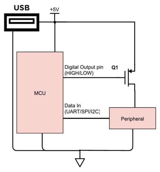 The FQP27P06 transistor selected for power gating has a few key characteristics, i.e. low drain-source voltage, low on resistance at source-gate voltage of 4.5 V–5 V []. These are key characteristic as many peripherals used have a 3.3 V–5.0 V supply voltage requirement and we seek to avoid taking away minimal amount of supply voltage headroom from the peripheral devices.