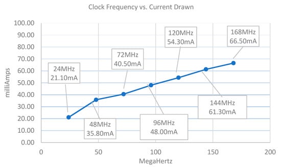 Matching a feature of the LEAP architecture, clock speed reduction is also a feature that can be used to manage power consumption. Observing idle current drawn across multiple clock speed yields Figure 3.