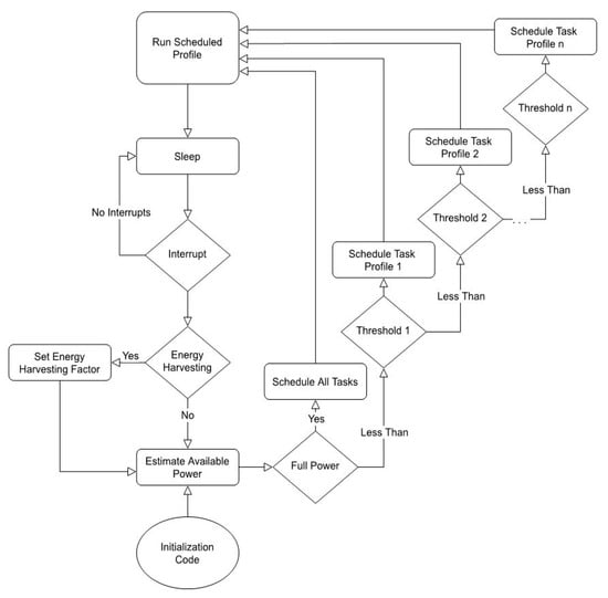 The merging of these hardware and software techniques occurs via programmed logic executed by the system on-board MCU. Environmental and stored battery energy conditions are observed and then checked against power thresholds to determine an appropriate task scheduling profile as shown in Figure 2. These profile and thresholds are malleable and defined by the user; thus, it should be noted that the performance is highly dependent on the designers’ thresholds and the current status of the environment.