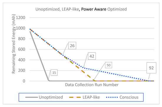 In order to compare this architectures performance with LEAP a mockup scenario is run. Supplied by a 1000 mA-hour stored energy, loaded with environmental sensors, and tasked to sample the environment hourly we compare the amount of remaining stored energy over the number of sampled taken. The same method used in formulas (1) and (2) can be applied to charge in Equation (3):