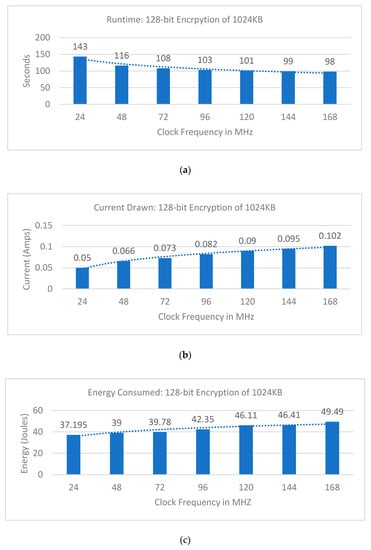 The first set of performance data collected explored the impact of system clock frequency on the task runtime and system current drawn. For consistency these results only include data for a text file size of 1024 Kilobytes. Figure 5 below illustrates graphs that incorporate runtime, current and power for each clock speed. It can be observed from Figure 5a that the benefit of shorter runtime by running the system clock frequency started to diminish from a 96 MHz onwards, yielding minimal runtime saving. The maximum runtime saving is achieved from 24 MHz to 48 MHz. Figure 5b shows the approximately linear relation in the current drawn by the system with various frequencies. Figure 5c shows the total energy consumed under each frequency setting, which again shows linear relationship. Based on these data, user can select the desired runtime to encrypt sensor data based on the absolute performance required, by prioritizing either on minimal run-time or energy consumption.