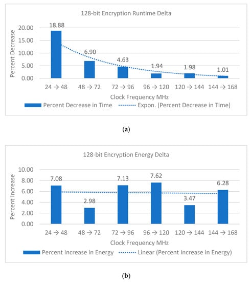 Relative decrease in runtime and increase in power for each iteration of increasing clock frequency: (a) percent decrease in runtime shows diminishing returns as further increases in clock frequency cease to yield significant reduction in runtimes; (b) percent increase in power shows consistent change. A preference of operating at 72 MHZ and/or 144 MHZ is developed as these frequencies yield the lowest relative increase in energy over the next slower frequency.