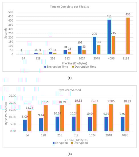 Further design considerations must be taken account when looking at text file size to be encrypted and overall throughput in bye per second that this system can generate. Our findings in Figure 7 show that with varying file size the bytes per second throughput remained constant which implies that a doubling in file size lead to a near doubling in encryption and decryption time. This analysis allows designers and decision-making algorithms to estimate power consumption as a function of text file size as the throughput remained consistent with each doubling of the text file size. We also note that the system’s throughput peaks at about 18–19 kiloBytes per second. This indicated a saturation of the data lines used to process the encryption and decryption. Our initial assumption is a saturation of the SPI bus data rate, however further testing is needed to confirm this.