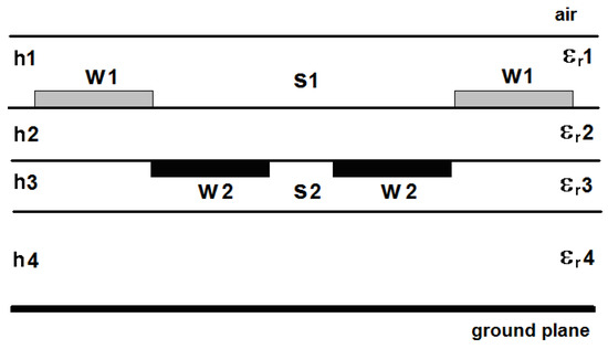 Cross-sectional view of a multilayer dielectric structure used for the design of differential bi-level microstrip 3-dB directional coupler.