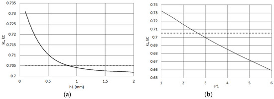 As it is seen both the thickness and the dielectric constant of the top layer influence the capacitive coupling coefficient. The inductive coupling coefficient is not influenced, since it depends on conductor geometry only, and can be calculated from the capacitive matrix of the homogeneous air filled geometry (not depending on any dielectric properties). The application of additional dielectric layer lowers the capacitive coupling coefficient and it is required to adjust the parameters h1 and εr1 to obtain equity of both inductive and capacitive coefficients.