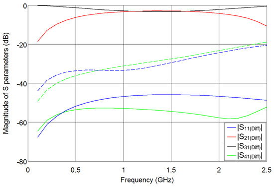 Electromagnetically calculated differential S-parameters of the four strip coupled-line section operating in a differential mode: the compensated section is represented by solid lines and uncompensated one by dashed lines.