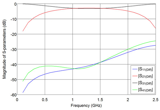 Electromagnetically calculated differential S-parameters of the compensated differential coupled-line directional coupler.