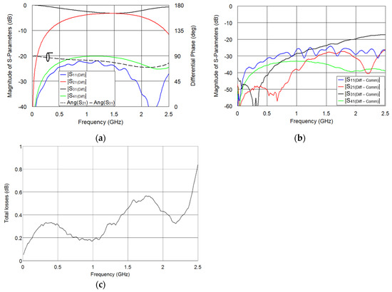 Measured magnitudes of differential S-parameters (solid lines) and phase characteristic (dashed line) (a), differential-to-common mode S-parameters (b) and the measured total losses (c) of the manufactured compensated differential coupled-line directional coupler.