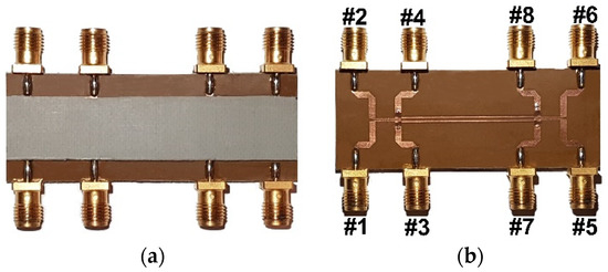 Photograph of the manufactured 3-dB differentially-fed directional coupler (a), and the coupler with the top compensating dielectric layer removed, showing the coupled traces and ports’ labeling (b).