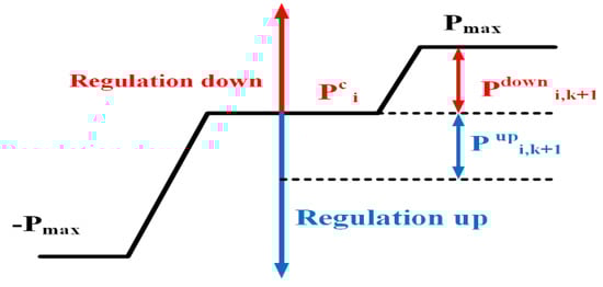 Two scenarios are pertinent to mention in Figure 5. Firstly, if the battery of the SOC was initially greater than the real-time SOC, the V2G power for up-regulation was greater than that for down-regulation, mainly because maintaining the SOC of the battery in such circumstances requires battery operation in the discharging mode. Conversely, if the initial SOC was less than the real-time SOC, the V2G power for up-regulation was less than that for down-regulation. In such a case, the power calculation for the increasing energy level of the battery was different from that described in Figure 5. A new principle, as depicted in Figure 6, dictated the charging/discharging power of the EV, where it was distributed into the regulation dispatch expectation and charging schedule of the EV for the continual charging demand.