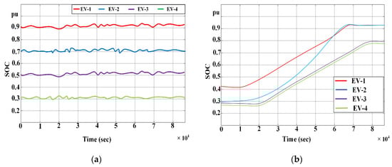 Real-time battery state of charge for the four EVs under consideration for (a) TYPE 1, Charging Station 1 and (b) TYPE 2, Charging Station 1.