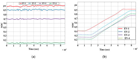 Real-time battery state of charge for the four EVs under consideration for (a) TYPE 1, Charging Station 2 and (b) TYPE 2, Charging Station 2.