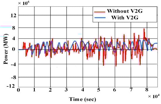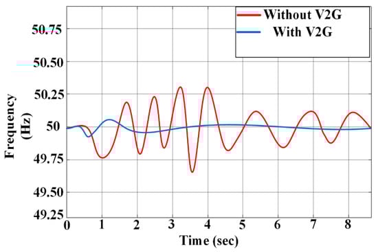 The assimilation of EVs in the IMGs solely impacted the generating unit’s power output in the context of PFC. This was mainly due to the EVs and generating units taking a combined responsibility for PFC. In cases where PFC responded to deviations in system frequency, there was also a slight influence on the output of generating units not directly participating in PFC. This impact of V2G on IMG is evident in Figure 17, where the PFC pre-and-post V2G implementation is demonstrated through frequency fluctuations in the recorded time interval.