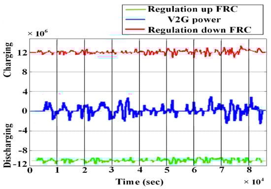The FRC calculation holds great significance for EVs employed in PFC. The value of the FRC in such cases changes according to the real-time changes in charging/discharging power. Thus, the value of the upcoming time slot was based on the value of the existing time slot, as given in Equation (2) below.