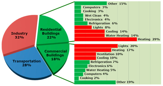 In terms of energy consumption, a large proportion of total energy is consumed by commercial and residential buildings, most of which is electricity. According to the U.S. Department of Energy, about 40% of total energy is consumed in buildings in industrialized countries, among which 66% is electricity [10,11]. Figure 1 shows the energy consumption structure of the U.S.