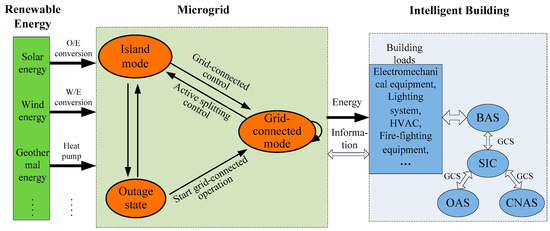 As an effective way to handle the uncertainties of renewable energies, microgrids provide an economical and reliable energy supply for buildings. Intelligent building is the result of a combination of building technology and control technology, communication technology and computer technology [15,16]. By constructing an integrated intelligent platform covering the whole building, intelligent building realizes the automation and intelligence of subsystems such as equipment, communication, office, air conditioning, security and monitoring. It needs a large number of components to run and produces a great deal of energy consumption, mainly the consumption of electric energy. In this situation, the type of building will change from intelligent building to green intelligent building, which is also called low energy building [17,18].