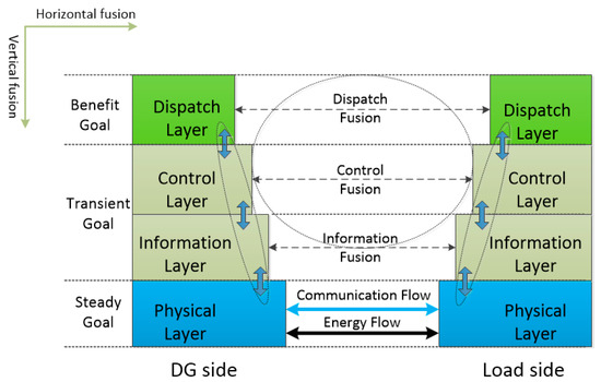 The framework of two-dimensional fusion for an MGIB with composite loads is shown in Figure 3. In the framework, both the load side and the DG side have four logical layers: the physical layer, information layer, control layer and dispatch layer. Each upper layer is served by each lower layer. For example, the control layer needs to aggregate information from the information layer to make control decisions based on control algorithms. Meanwhile, it needs to send the control decisions and the aggregated information to the dispatch layer to obtain optimized scheduling for longer time granularity.