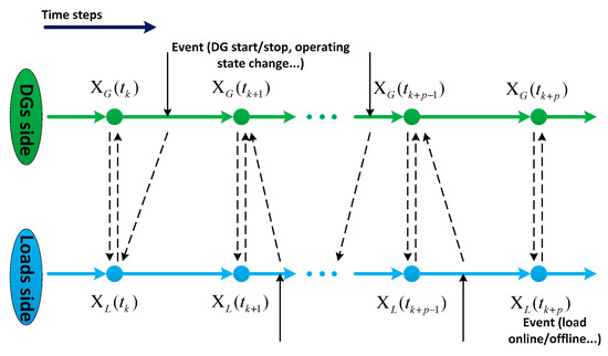 The two-sided state transition mechanism of MGIB is illustrated in Figure 4. The DG side and load side periodically exchange information in a small time slot along the time axis and update their status based on this information. In addition, non-periodic external events can also trigger transitions in the current state. External events not only include physical events, such as DG start/stop, operating state change, load online/offline, but also include logical events such as information fusion results, consistency control information, demand response information, etc.