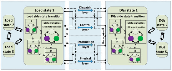 Firstly, let us discuss the structure of the state transition model. Both sides of the system are modeled as a double-layer FSMs from the outside to the inside. On the load side, the outer FSM maintains the load side state variables and state transition according to the load side events and information fusion results. The inner FSM maintains the state variables and state transitions of each load according to the specific load event and information. On the DG sides, the double-layer FSMs are similar to the load side. In the middle of two sides shown in Figure 5, the two-dimensional fusion model mentioned in Section 2 provides a transparent service for the physical layer, information layer, control layer and dispatch layer to enable the interaction between the load side and DG side.