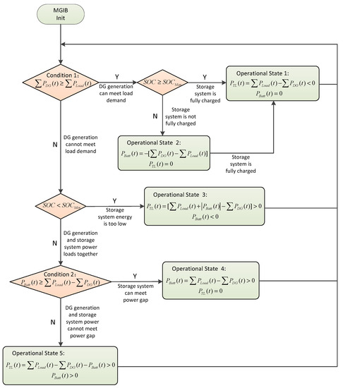 Operational State 1: The sum of the DGs is greater than the sum of the power demand of the loads, and the energy storage system is already fully charged. In this situation, the microgrid transfers excess power to the distribution network. The storage system works in the ‘pass-by’ mode, neither charging nor discharging.