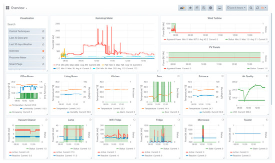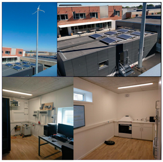 The IoT-MGLab is located in the building Pontoppidanstræde 109-A of the Department of Energy Technology in Aalborg University, Denmark. The laboratory is equipped with several means of distributed generations, such as PV panels, a wind turbine and an underfloor heating–cooling system, and is expected to be equipped in the near future with a controllable micro-combined heat and power (mCHP) generator and EV charging infrastructure to form a fully featured autonomous and IoT-enabled residential MGIB. Figure 7 shows photographs of the IoT-MGLab.