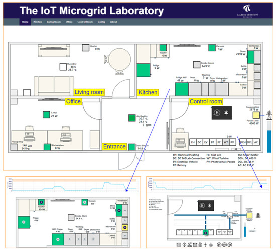 Figure 8. shows the infrastructure of the IoT-MGLab for the digitalization and control of the MGIB system. The IoT-MGLab is designed to emulate a residential building which consists of four areas: a control room, a kitchen, a living room and an office. The energy resources, such as the utility grid, PV system, wind turbine, battery, EV charger and fuel cell are connected to the common buses in the control room. Finally, three power buses are provided for the household supply ring, which are AC 230V, DC 48V and DC 400V.