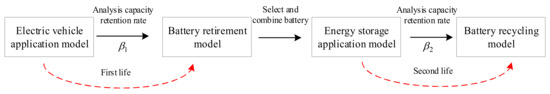 One of the most common functions of energy storage system is to improve the grid’s ability to absorb renewable energy [6,7], but the widespread application of energy storage system in the power grid has been limited due to some factors. The biggest obstacle to distributed energy storage systems participating in grid operations is the high cost of batteries. Electric vehicles can participate in the optimal dispatch of the dispatch network [8,9] and the retired battery can be used to form an energy storage system. The contradiction caused by the high cost can be greatly alleviated if the cost of the battery can be reduced and the performance requirements in the energy storage field can be met.