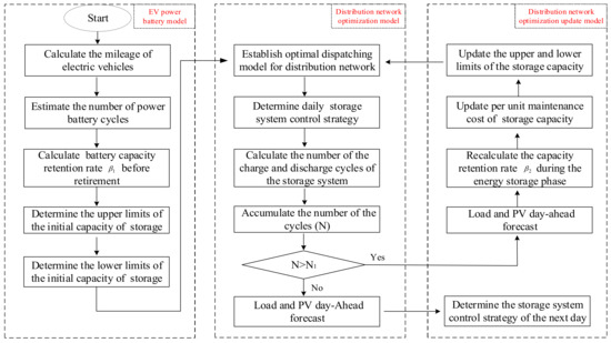 The rest of this paper is organized, as follows. In Section 2, a calculation model of power battery capacity retention rate in two life stages is established. The electric vehicles (EV) mileage model and capacity retention calculation model are established to calculate the initial capacity of the energy storage; cycle life loss model is established to dynamically update the energy storage capacity; the four-quadrant grid-connected operation model is established to explain the principle of energy storage participation in optimal scheduling. Subsequently, in Section 3, a day-ahead scheduling model with different objective functions is set up. Furthermore, simulation analysis is implemented on IEEE 37 test feeder in Section 4, and some useful conclusions are finally drawn in Section 5.