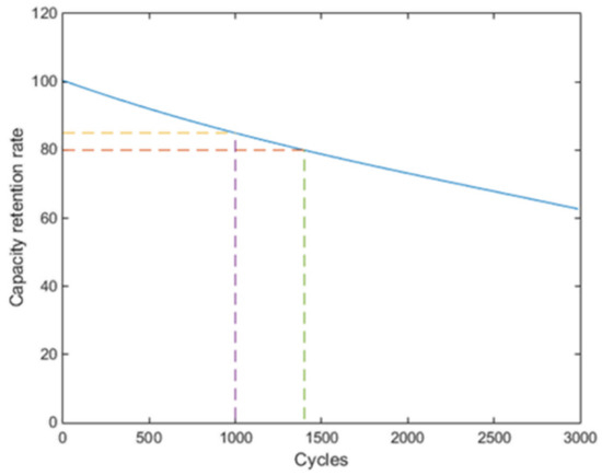 The battery can continue to be used if the cumulative number of cycles of the power battery is less than a specified value; if the cumulative number of cycles is larger than or equal to the specified value, the battery needs to be downgraded, and it is used to become the part of SUESS. The corresponding power battery is replaced with a new battery; the cumulative cycle number of the battery is corrected to zero. In this article, it can be analyzed that, when the cumulative number of cycles reached 1400, the critical capacity retention rate reached 80%, and the battery is retired. The following process is shown in Equation (4)