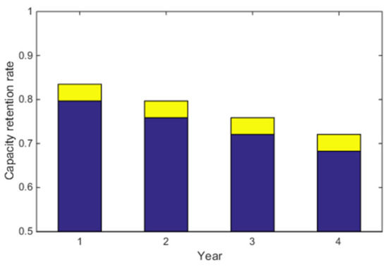 Figure 6 shows the relationship between the battery capacity and the number of cycles in the life cycle of an electric vehicle. It can be seen that, when the battery is retired, that is, when the capacity retention rate drops to 80%, the number of power battery cycles is close to 1400; Figure 7 shows that, with the continuous use of retired power batteries, the capacity of the battery is gradually reduced, according to the capacity decay formula. It is assumed that the initial available battery capacity is 83.47%, and the available battery capacity is reduced to 72.06% after the third year. The decline of battery capacity will reduce the cycle interval of energy storage step utilization, and the energy storage capacity that is used for peak clipping and valley filling will decrease, which will affect the efficiency of step utilization. Once the energy storage system is unable to meet the externally required active and reactive power due to the reduced capacity, it might cause hazards, such as voltage rise. In addition, when maintenance costs are too high, the old energy storage system needs to be replaced in a timely manner.