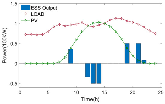 When the outer loop controller in the PCS detects the active and reactive power required by the distribution network, the inner loop controller controls the SUESS active and reactive power output to be larger than zero. At this time, the SUESS releases the active and reactive power to the grid, and the state of battery is discharging, external reactive power compensation is performed at the same time, which corresponds to the SUESS working mode in the first quadrant; when the outer loop controller detects active and reactive power surplus in the distribution network, the inner loop controller controls the active and reactive power output to be less than zero. At this time, the power grid sends active and reactive power to the SUESS, the battery is in a charging state, and the capacitor absorbs reactive power from the distribution system, which corresponds to the SUESS operating mode in the third quadrant. Similarly, the SUESS can also work in the second, fourth quadrants, or coordinates where it can flexibly control its charge and discharge status according to actual outside needs. The operation strategy of the SUESS is derived through economic optimization based on the typical daily load. It can be maximized renewable hosting capacity under the condition of meeting all of the limits set by the distribution network.