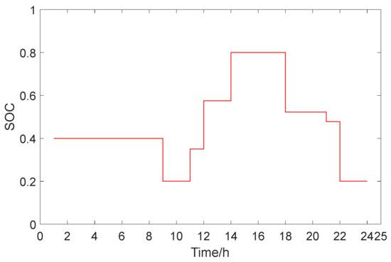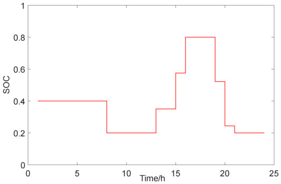In actual situations, the dispatching period of the power grid is generally 15 min. or 30 min. Since the actual data (PV data, load data, etc.) used in this paper are hourly data, the size of the energy storage charge and discharge in the optimization variables is also an hourly variable, and the figures show step changes in battery SOC. Figure 12 and Figure 13 show the capacity rate status of SUESS in a day. It can be seen that the SUESS composed of power batteries not only improves the system’s ability to absorb PV and reduce the peak-to-valley difference, but also the total investment cost of the energy storage system composed of power batteries is lower than that of the new energy storage system, according to the optimization results above.