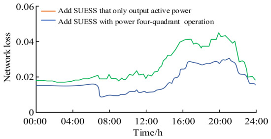 Figure 14 shows the network loss of the system under the two cases. The network loss that adds SUESS with power four-quadrant operation is reduced by 0.1958 (p.u.) than traditional energy storage. The network loss of the system under the two cases is almost the same due to the small impact of PV output from 0:00 to 7:00. The SUESS output of the four-quadrant power can be regulated by reactive power to avoid unnecessary power loss. From the figure, it can be observed that the network loss has greatly reduced. The network loss is directly dependent on the line current amplitude. The line current amplitude is positively related to the active and reactive power flowing through the line and negatively related to the voltage of the first node. Only the active power portion of the line can be reduced if only the active power adjustment is performed. Therefore, the total network loss of pure active power adjustment results will naturally be relatively high.