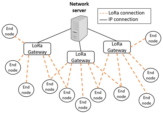 A LoRaWAN network typically works over a star-of-stars topology, as shown in Figure 1, in which the end-nodes communicate with the network server through gateways.