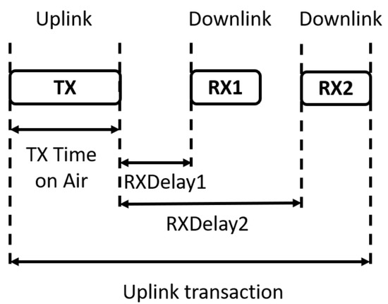 Once a message is generated, the end-node attempts to transmit. After each uplink transmission the end-node opens two receive windows. The first receive window, named RX1 in Figure 2, starts seconds (+/− 20 s) after the end of the uplink transmission. The second receive window, named RX2 in Figure 2, starts seconds (+/− 20 s) after the end of the uplink transmission.