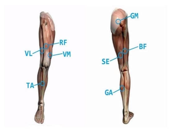 Gluteus maximus (GM), vastus medialis (VM), rectus femoris (RF), vastus lateralis (VL), semitendinosus (SE), biceps femoris (BF), tibilis anterior (TA) and gastrocnemius (GA) were selected as sEMG signal [15]. The functions and positions of muscles are shown in Figure 3.