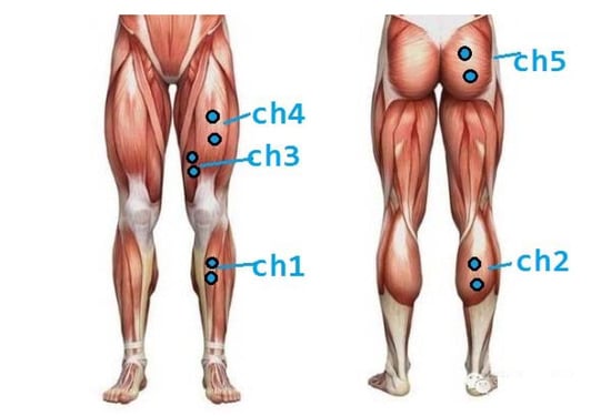 As shown in Table 1, sEMG signals of GM (ch5), RF (ch4), VM (ch3), GA (ch2) and TA (ch1) will be collected as input signals in subsequent experiments. The collected muscles and sensor channels are shown in Figure 4.