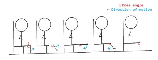 Knee joint stretching and bending is the most commonly used rehabilitation exercise for patients with lower extremity paralysis in the hospital, so we used knee joint stretching and bending exercises as the basis of the first group of experimental actions [18]. The first group of experiments mainly studied the flexion and extension motion of the knee joint and analyzed the flexion and extension motion trend of hip joint and ankle joint. Through the comprehensive analysis of the three joint movements of lower limbs, the sEMG signals could predict the joint angles more accurately and achieve a better rehabilitation effect. Volunteers sat in a chair 60 cm high, with their legs suspended naturally, their hips, knees and ankles relaxed, and then extended and bent their knees periodically. The action breakdown is shown in Figure 6. The knee extension and flexion movements were divided into: (1) fast knee extension and flexion movement, 3 times in 10 s; (2) slow knee extension and flexion movement, 2 times in 10 s. The knee angle is defined as the angle β between the thigh and the lower leg.
