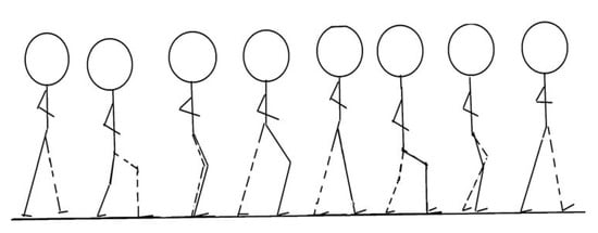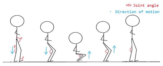 Walking and squatting are the most common daily movements of the lower limbs, and the complete rehabilitation training should also include the daily movements. The purpose of this study was also to predict the intention of lower limb joint movement in walking and squatting [19]. The schematic diagram of action decomposition is shown in Figure 7; Figure 8. The angle of the hip joint is defined as the angle between the limb stem and the thigh, the angle of the knee joint is defined as the angle between the thigh and the calf, and the angle of the ankle joint is defined as the angle between the calf and the dorsum of the foot.