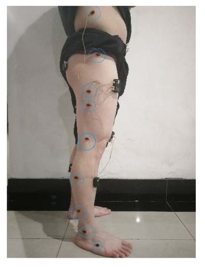 We selected the muscles identified in Section 2.2 to collect sEMG signals and selected appropriate locations to place Codamotion markers near the hip, knee and ankle joints, as shown in Figure 9.