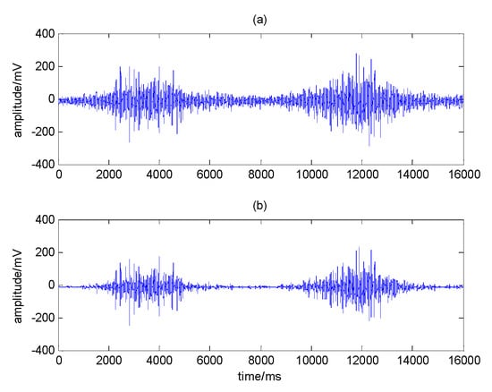 It can be seen from Table 3 that the IMF components of the first three layers are effective, so the sEMG signal can be reconstructed from the IMF components of these three layers. The comparison between the original signal and the denoised signal in this noise reduction experiment is shown in Figure 12.