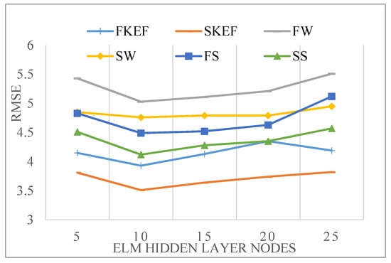 Among them, is the number of neurons in the hidden layer, is the number of neurons in the input layer, is the number of neurons in the output layer, and is a constant between 1 and 10. Then, we chose 5, 10, 15, 20 and 25 as hidden layer nodes and built a prediction model for each hidden layer node. Finally, we used the verification set of each action to verify the prediction performance of the prediction model. Among the five models, we chose the model with the least RMSE in the verification experiment, and thought that it can predict the experimental results well. After the comparison experiment on the number of hidden layer nodes, we can see from Figure 15 shows that in the ELM prediction model, choosing the number of hidden layer nodes as 10 can get the best prediction result.