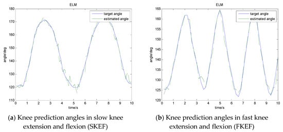 We selected fast knee extension and flexion (FKEF) and slow knee extension and flexion (SKEF) data as input data, and trained the ELM model to predict hip, knee and ankle angles for each feature. The RMSE is shown in Table 4, and the experimental results of using WP–RMS characteristics are shown in Figure 16.