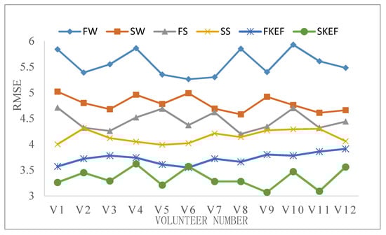 RMSE in Table 4 and Figure 16 is the average value of our experimental results. In most of the experimental results, the RMSE value of slow knee extension and flexion is smaller than that of fast knee extension and flexion. We can see that the prediction error RMSE increases with the increase of knee extension and flexion speed, and the prediction error RMSE obtained when WP–RMS feature is used as the input feature set is obviously better than other sEMG feature extraction methods. We also used the WP–RMS feature training ELM to study the prediction results of each movement of different volunteers. The RMSE values of all volunteers are shown in Figure 17. In all conditions, the same volunteers had greater predictive errors in FW. In the same condition, the difference in prediction error between the volunteers was not significant. The results show that our method can achieve good prediction performance for each volunteer. Fast walking is more complex and involves more muscles. The joint angles collected in the experiment are the vector angle on the vertical plane, and the actual joint angles of walking are three-dimensional, so fast walking has a greater RMSE value than fast knee extension and flexion.