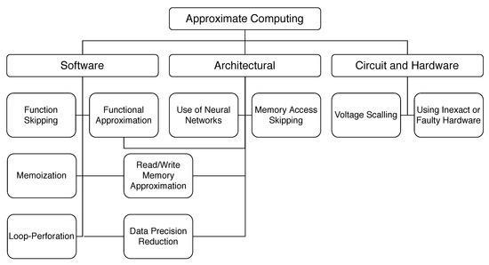 - Use of Neural Networks: A neural network can learn how a standard function implementation behaves in relation to different inputs via machine learning. In a complex system, the neural network can be used to implement approximate functions via software-hardware co-design. Traditional approximable codes can be transformed into equivalent neural networks that present a lower output accuracy but better execution time performance [26];
