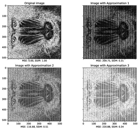 - Data Precision Reduction: Data precision reduction is one of the techniques that can be implemented both at a software and architectural level. Reducing the data precision of an application (i.e., the number of bits used to represent the data) is a straightforward technique to reduce memory footprint. Reducing memory usage also reduces energy consumption at the cost of accuracy (i.e., less data have to be transferred from/to the memory). In [23], the authors show that reducing floating point precision on mobile GPUs can bring energy consumption reduction with image quality degradation. This degradation, however, can be acceptable and even unperceivable for the human eye. Lower memory utilization is suitable for safety-critical systems because it reduces the essential and critical bit count, making them less susceptible to faults. Reducing the bit-width used for data representation is also a popular approximation method [24]. The way data precision reduction can be used to approximate software and FPGA applications is obvious: It is a matter of code modification. In software, the precision of floating-point units can be easily modified with the use of dedicated libraries, or even by merely changing the type of the variable. The same can be done at VHDL/Verilog projects: A design can be adapted to process smaller vectors of data. Data precision reduction can bring good improvements in area and energy costs for hardware projects, but frequently do not present high costs reduction on software. Fixed-point arithmetic, for example, can be used to approximate mathematical functions, such as logarithm, on FPGA implementations providing low area usage [25]. On software, however, it can increase the execution time of the application because all the operations and data handling routines are implemented at the software level;
