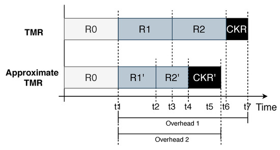 Figure 4 presents an example of the ATMR method. In the figure, R1’ and R2’ are redundant tasks of R0 with fewer iterations, while R1 and R2 are hard copies of R0. Please note that the considered TMR exploits timing redundancy. The redundant tasks (R1, R2, R1’, and R2’) are executed serially after R0. The three results are then compared and voted by the checker. The overhead of a TMR consists of the extra execution time it costs. On the other hand, the overhead of the checker (represented at the figure by the CKR box) is constant. However, reducing the execution time of the tasks, the overhead of the TMR can be lowered. As R1’ and R2’ execute faster than R1 and R2, the ATMR presents a speedup in relation to the TMR.