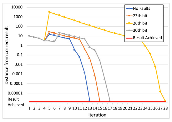 Let us analyze how a successive approximation algorithm such as Newton–Raphson would behave a real case scenario, such as executing inside a safety-critical system, subject to faults caused by external sources. Figure 5 presents the evolution of the Newton–Raphson output concerning the iteration number when affected by faults. The y-axis of the graphs represents the distance between the current computed value and the final best achievable result for the algorithm (i.e., the absolute difference between the two), and the x-axis presents the current number of iterations executed. The algorithm should finish after 14 iterations if no faults were injected. The “No Faults” curve shows the evolution of an execution with no external faults injected. Faults are injected in the memory word that holds the latest computed value (i.e., the output from the last executed iteration), and all faults are injected precisely at the end of the 5th iteration of the algorithm. Each curve presents the progression of the algorithm result with one fault injected in a different bit of the word, as the legend shows. The curves show the apparent tendency for the algorithm to correct itself and end up finding a good result even under external fault injections. In all the cases the algorithm deviated from the expected result evolution curve and took more iterations to finish, but was capable of finding it with no failures.