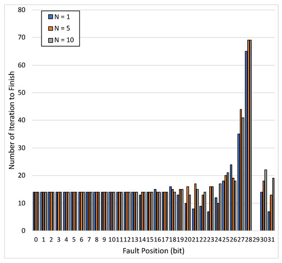 The inherent fault tolerance of the Newton–Raphson algorithm is also expressed in Figure 6. The data presented in this figure is from the same fault injections presented in Figure 5. The difference is that it now shows the impact of injecting faults on various bit positions of the memory word containing the resultant data, at three points of execution (i.e., iterations, N at the legend). In this figure the x-axis presents the position of the injected fault, and the y-axis bars show the number of iterations the algorithm took to finish. While Figure 5 shows the progression of the computation, Figure 6 presents the cost of achieving a correct output value when the algorithm is subject to faults. It is clear that some bit positions are more critical than others.
