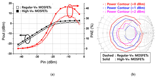 Simulation results of the three-stage inverter-based PA using regular-Vth metal-oxide-semiconductor field-effect transistors (MOSFETs) and high-Vth MOSFETs: (a) saturated output power (Psat), PAE, and (b) the power contour.
